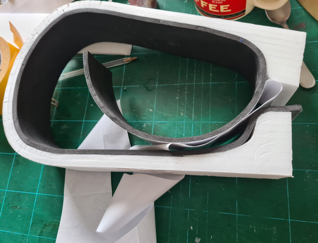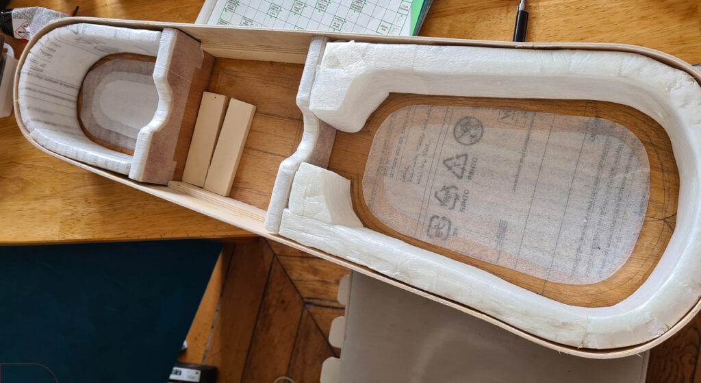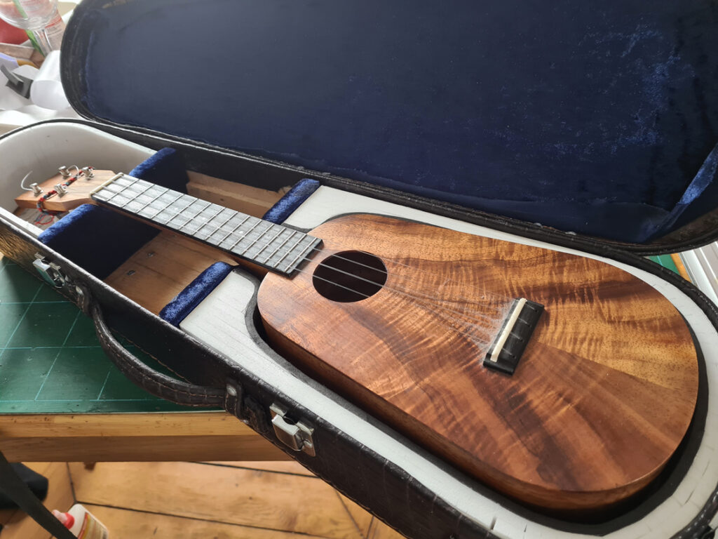 La fabrication de la caisse avance avec la réalisation des calages du ukulélé en polystyrène et en mousse d’emballage.