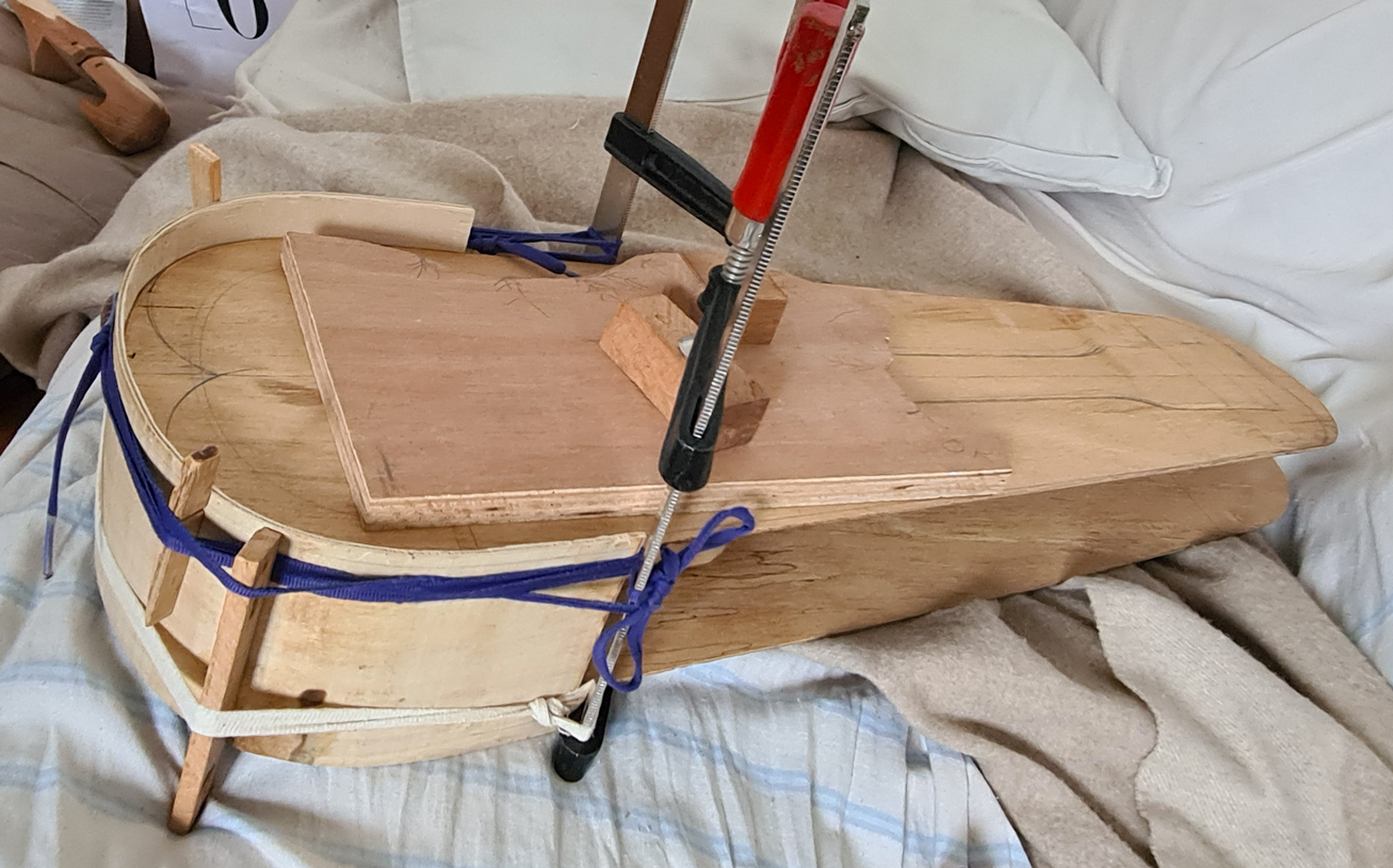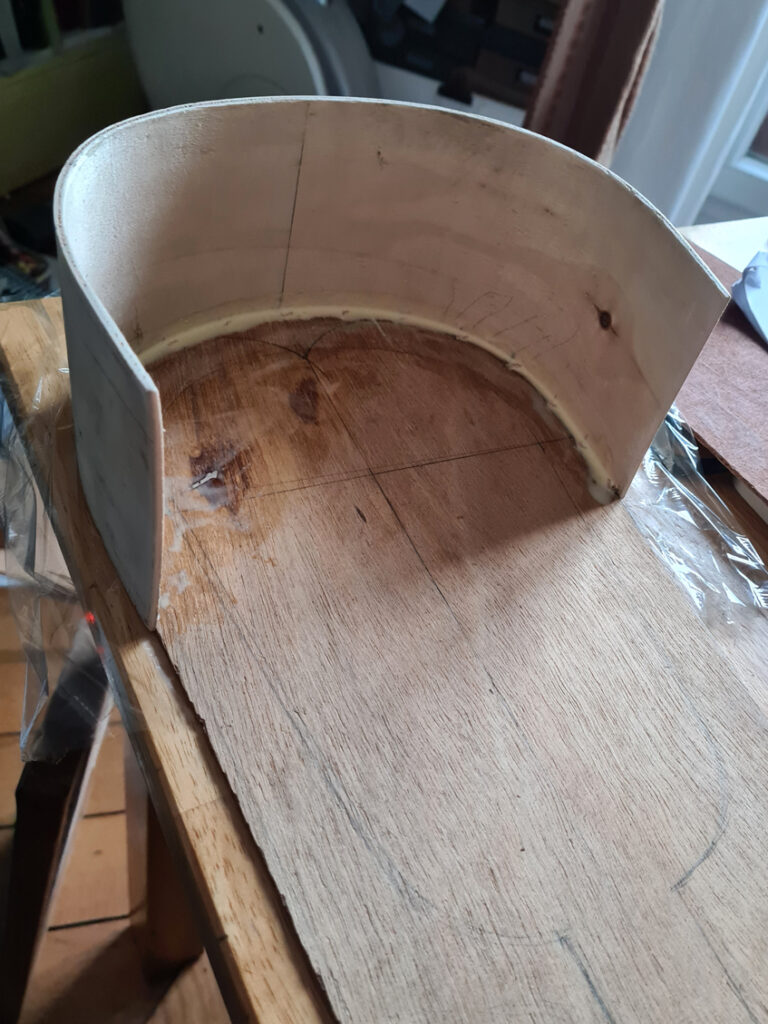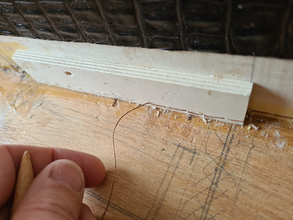 J’ai lié avec du fil de cuivre les différents éléments pour former la caisse: les dessus dessous, les deux bouts arrondis et les deux cotés. Ensuite un cordon de colle a sceller l’assemblage en recouvrant le fil de cuivre.