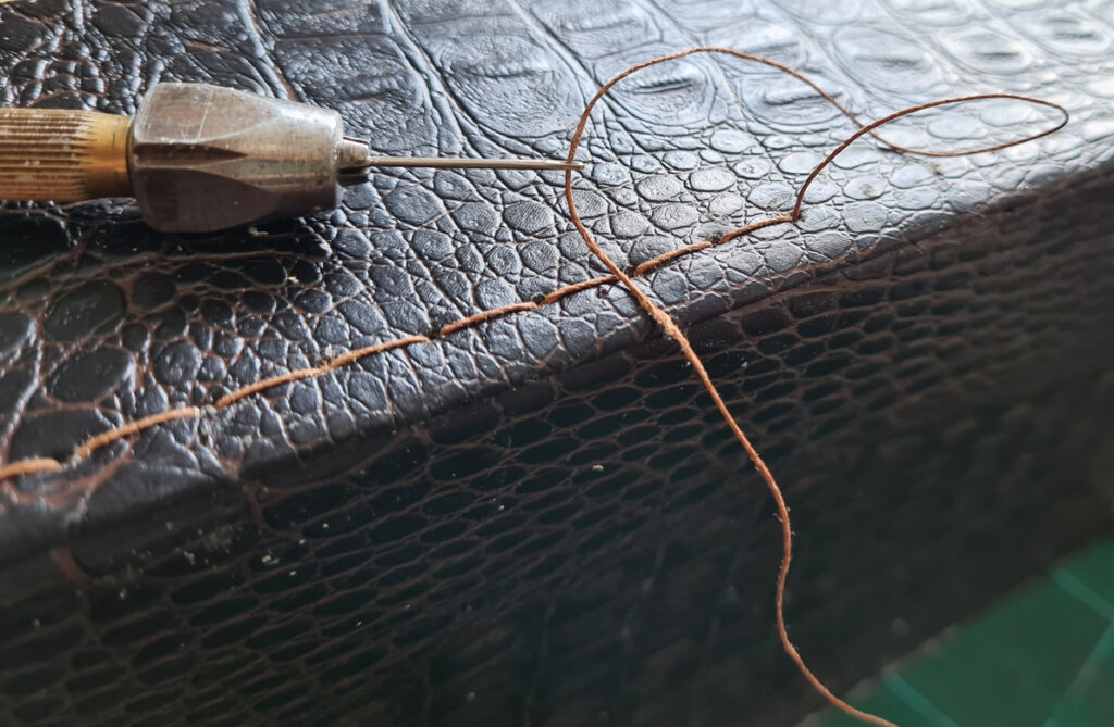 J’ai recouvert l’extérieur de la boîte avec le skaï façon crocodile et percé tous les trous de couture.