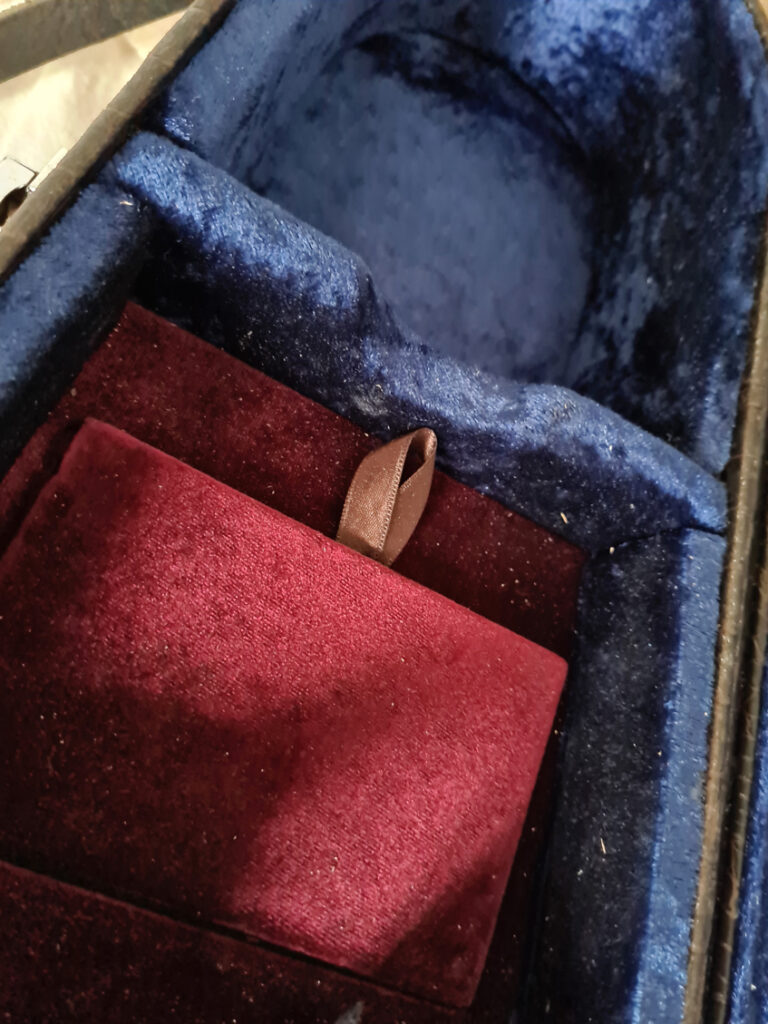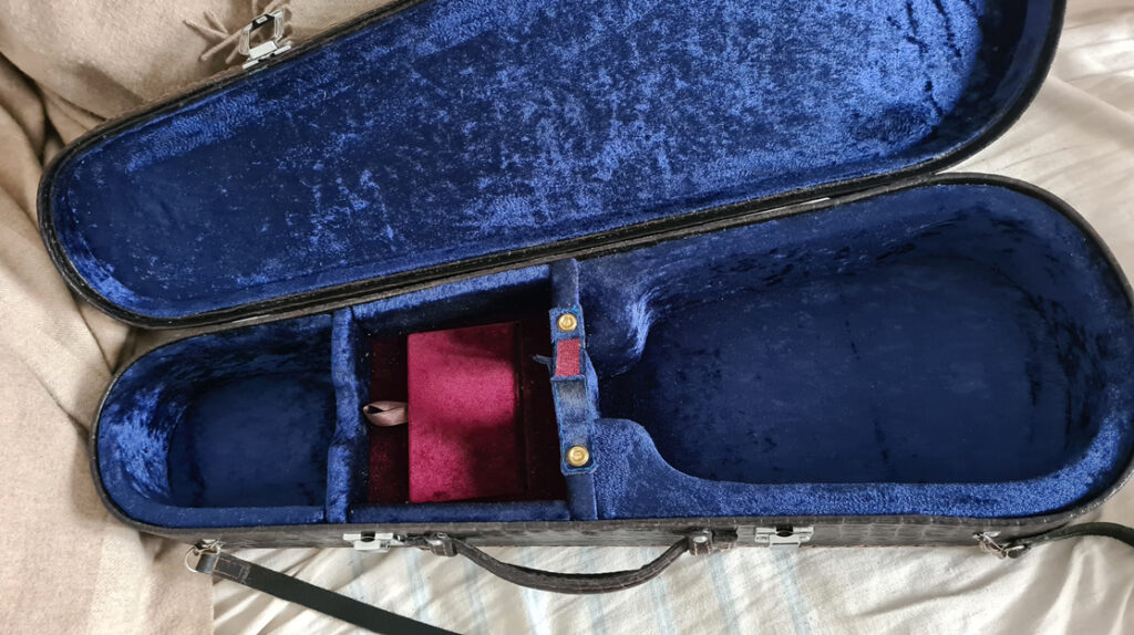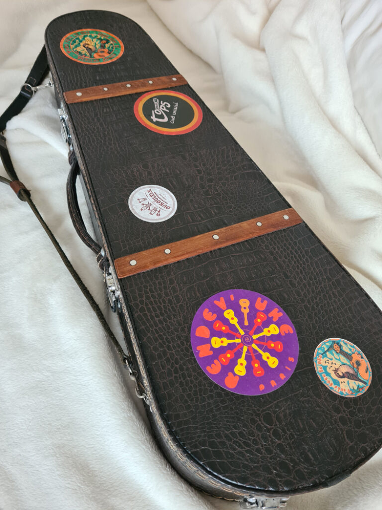Toutes les cales et l’intérieur de la caisse ont été recouverts de velours. Sous le manche, une boîte est destinée au rangement des piles, de l’accordeur et des cordes. Enfin, une bande Velcro maintient le ukulélé pour éviter les chutes.
