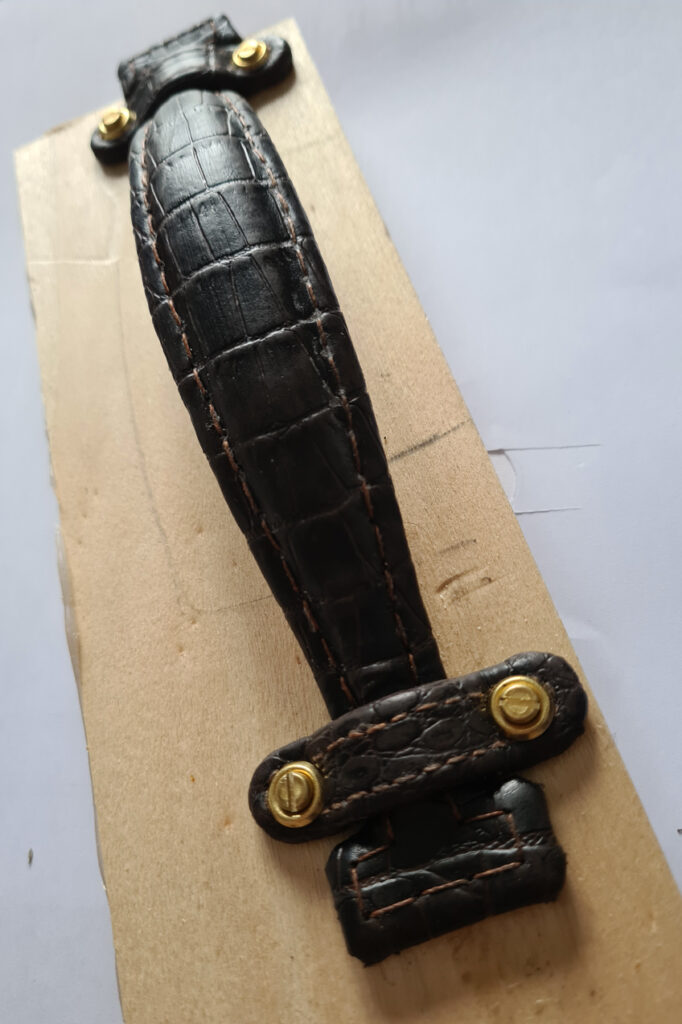 Tout l’accastillage extérieur (barres de renfort, charnières, poignée, lanières, fermetures) est mis en place avant les finitions intérieures. N’étant pas satisfait des poignées qui m’étaient proposées, j’en ai confectionné une dans le skaï croco, visible ici sur un support provisoire.