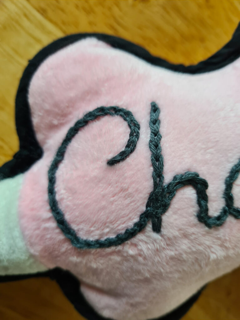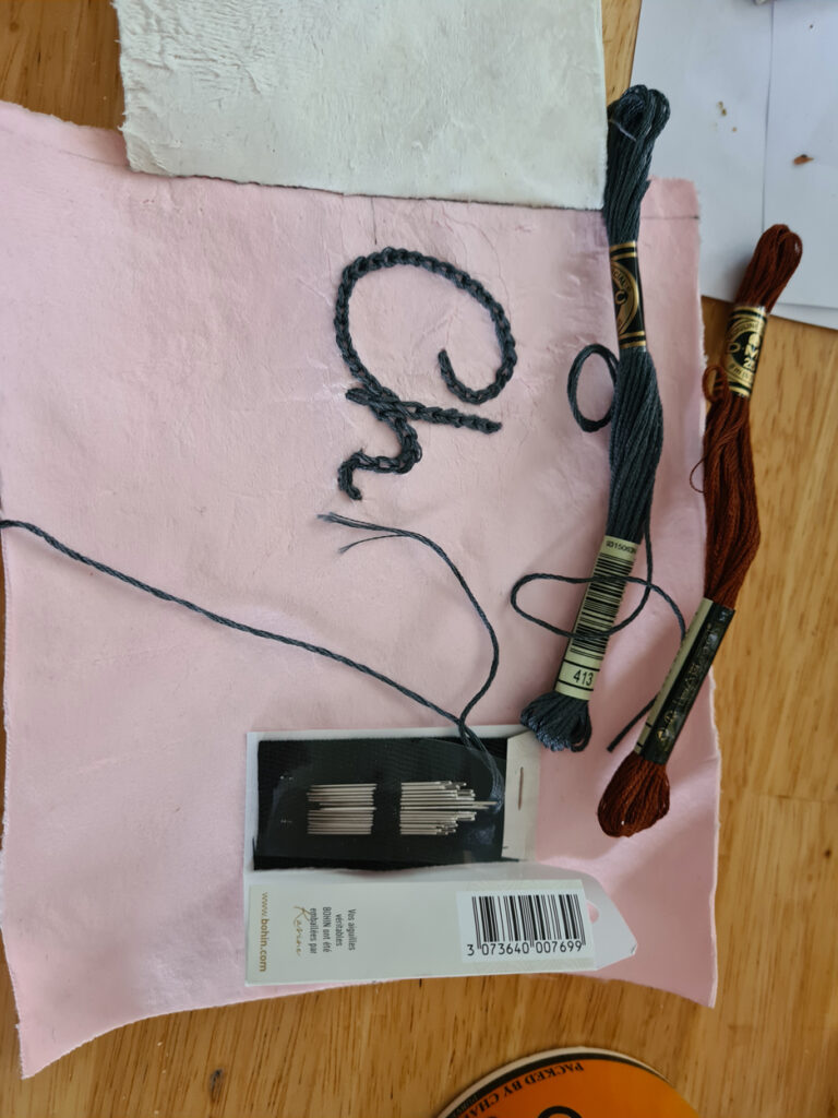 Entre typographie et broderie, j’ai conçu un alphabet dédié au point de chaînette. Grâce à une roulette de cordonnier, j’ai pu transférer mon dessin avec une précision absolue, point par point.
