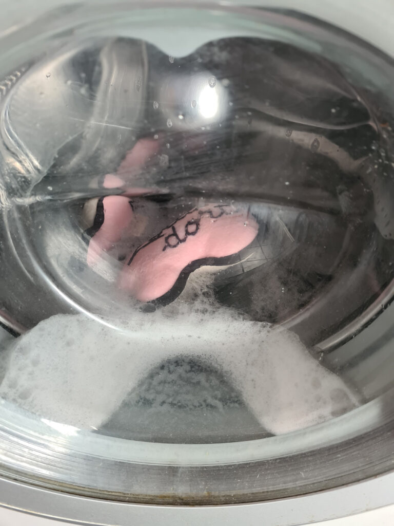 Les Doudoulélés rembourrés sont encore amidonné!Un petit tour à la machine à laver nettoiera les Doudoulélés de la Maïzena. Les matériaux utilisés, ont permit un séchage rapide.