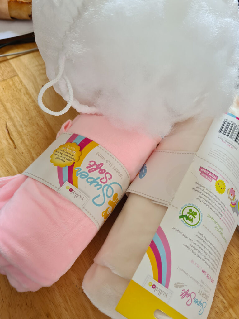 Quel plaisir de recevoir enfin ces matières ! Ma quête de douceur a porté ses fruits : voici le tissu idéal pour un câlin et le rembourrage au moelleux irrésistible. Le Doudoulélé