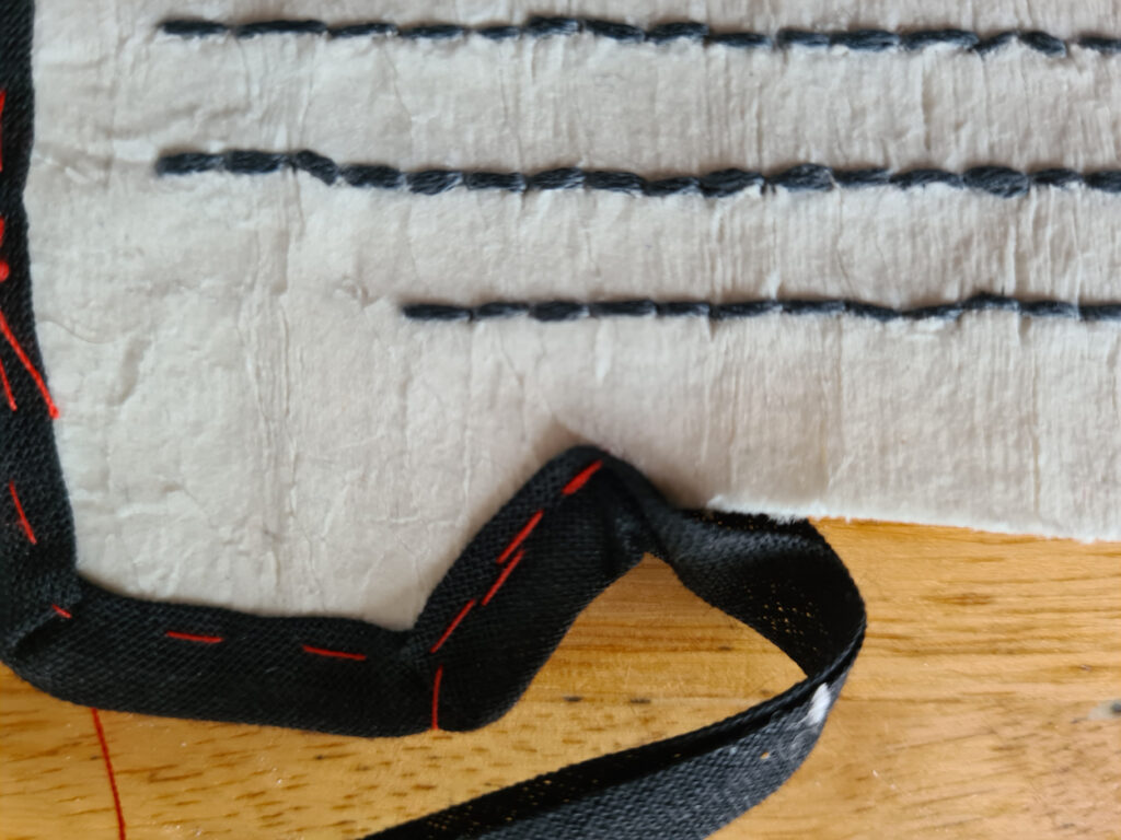 manuellement avec un fil de bâti rouge qui me guide pour la couture à la machine.
