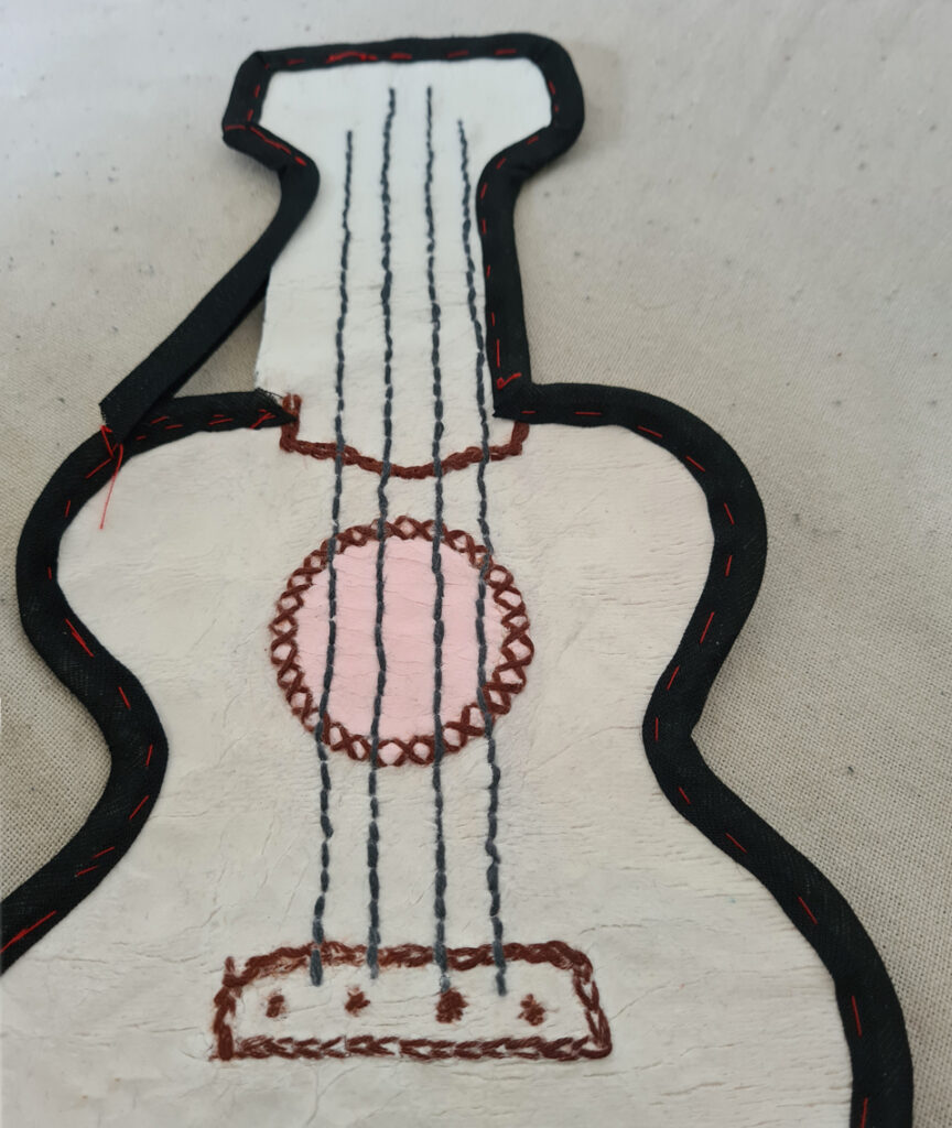 Pour structurer le Doudoulélé, j’ai choisi un biais noir qui dessine le profil. Je le fixe d’abord