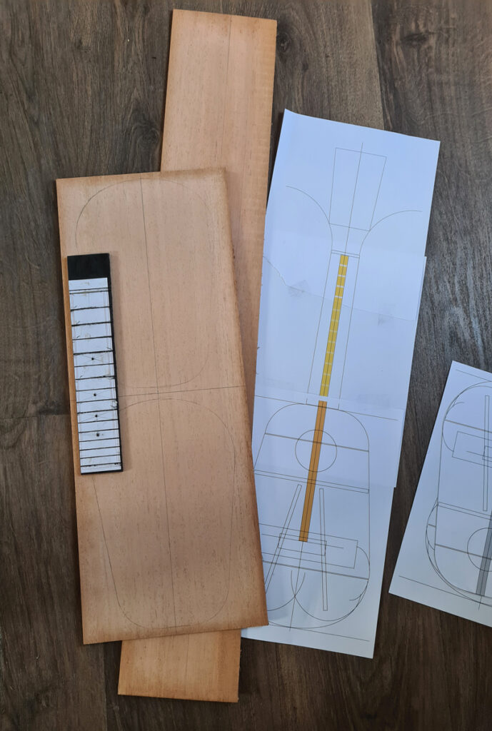 Grand randonneur, le destinataire souhaitait un ukulélé plus léger que le sien, doté d’un son rond et reprenant la forme de mon propre modèle. Celui-ci n’ayant pas encore de nom, je l’ai baptisé pour l’occasion « Nonem ». Pour obtenir cette couleur sonore, j’ai choisi une conception « tout acajou ». La touche, quant à elle, sera en ébène. Une fois les plans tracés et le bois sélectionné, j’ai débuté par la fabrication de la touche.