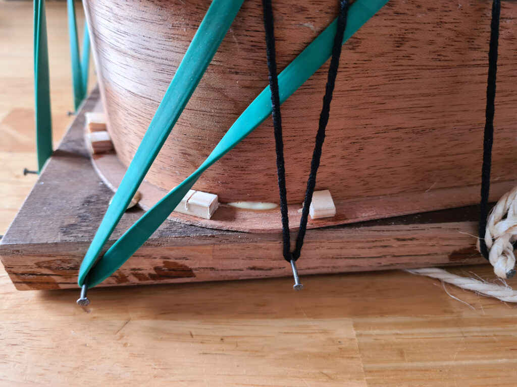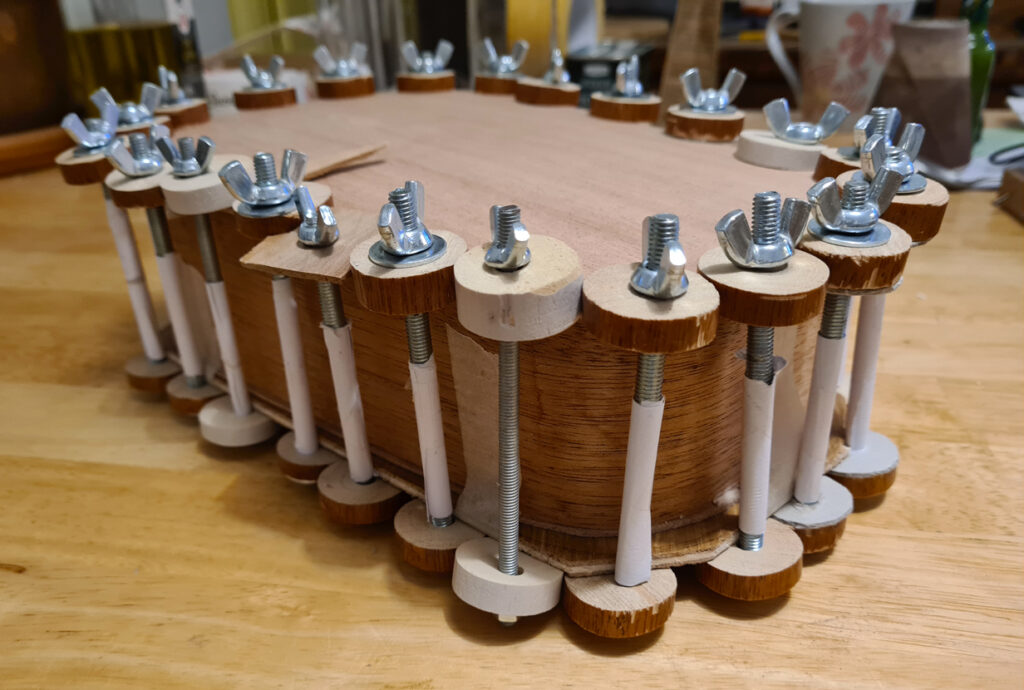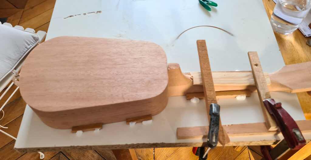 Le collage du fond est réalisé sous pression avec des serre-joints de fabrication maison.