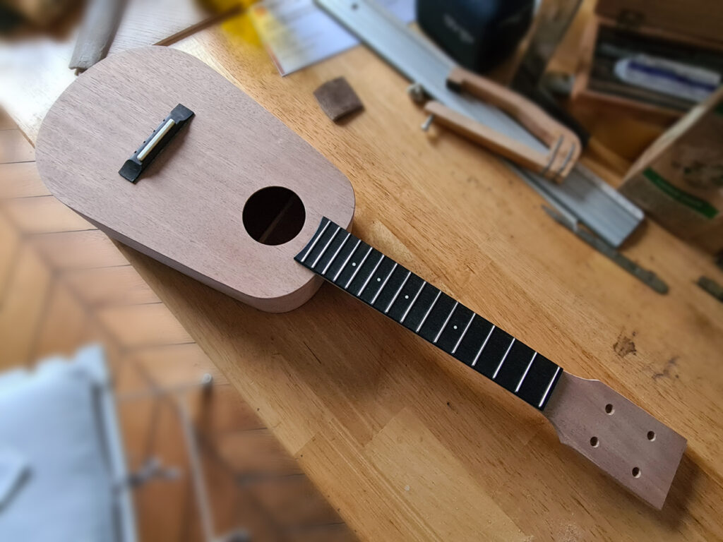 Les éclisses, les talons d’assemblage, l’ébauche du manche, les barrages, le fond et la table sont désormais prêts. Je vais maintenant pouvoir me concentrer pleinement sur le montage de l’instrument.