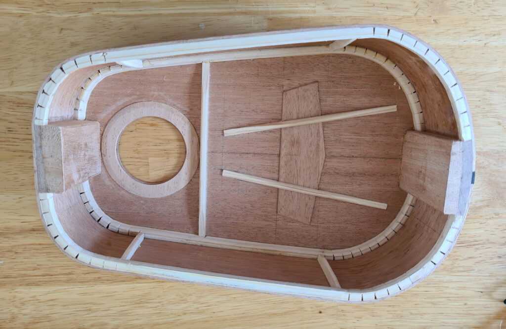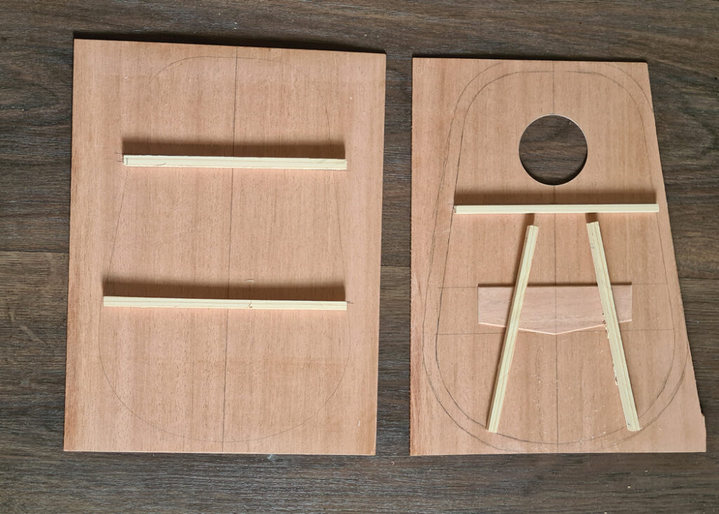 La table est collé et nous pouvons voir l’intérieur de la caisse, les barrages, les contres-éclisses. Pour ce ukulélé nomade, j’ai renforcé le tour de la bouche ainsi que les éclisses en collant des renforts verticaux.