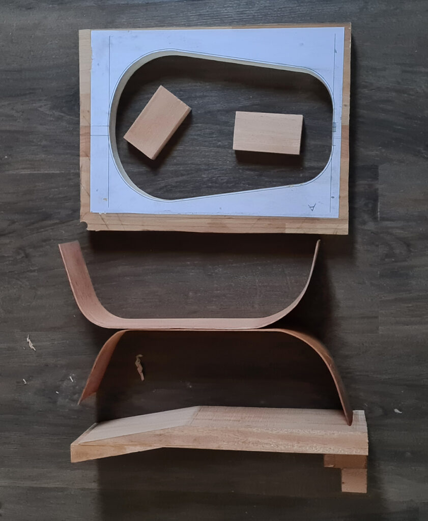 J’ai mis les éclisses, le fond et la table à leur épaisseur finale. Après avoir fait tremper les éclisses 24 heures dans l’eau, je les ai formées à chaud. Tous les éléments du ukulélé sont préparés les uns après les autres afin de respecter le délai de livraison : objectif avant Noël !