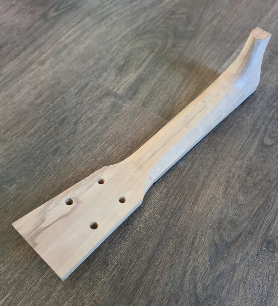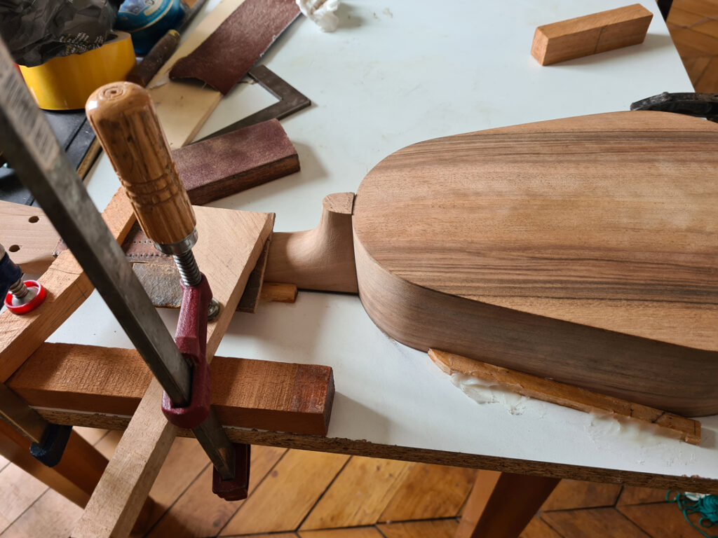 J’ai créé un banc de montage au quart de millimètre pour assurer l’alignement de la caisse et du manche. Petit à petit j’ai ajusté le manche pour qu’il s’adapte parfaitement à la caisse. Une fois l’adaptation faite le banc m’a servi pour le collage. La liaison a été parfaitement réalisé.