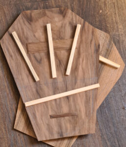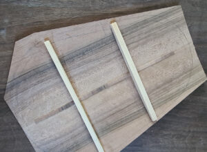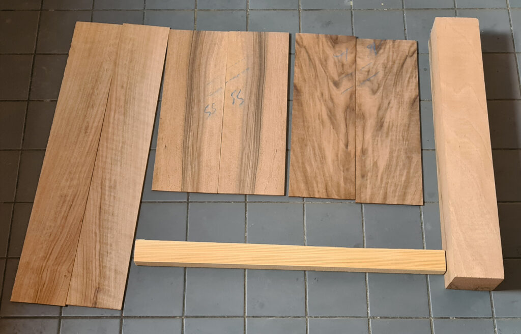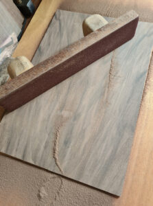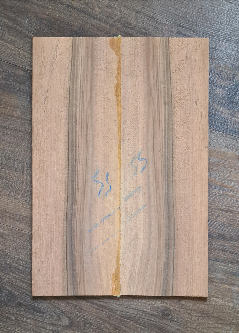 J’ai collé le fond et la table en portefeuille afin que les motifs du bois se rejoignent par symétrie. À cette étape, les planchettes présentent une épaisseur d’environ 4,5 mm.