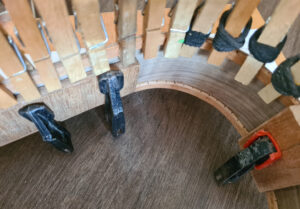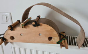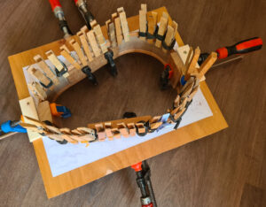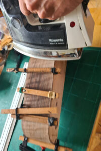 Pendant 24 h, J’ai immergé les éclisses dans l’eau afin de les assouplir. Je cale ensuite chaque éclisse sur la forme de moulage et, patiemment, je chauffe le bois au fer à repasser pour le plaquer contre le gabarit. Sous l’action de la chaleur, la cellulose se déforme pour épouser le galbe du moule. Des cales maintenues par des élastiques stabilisent la courbure de l’éclisse pendant le séchage.