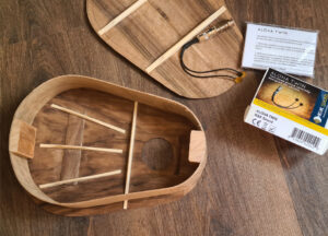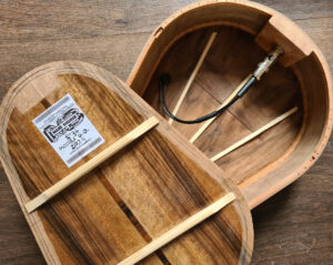 Les bois choisis sont le noyer pour la caisse et le manche, l’ébène pour la touche, l’épicéa pour les barrages.
