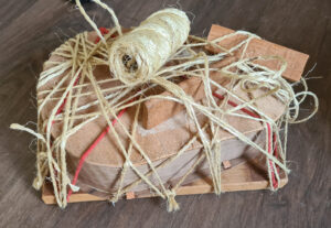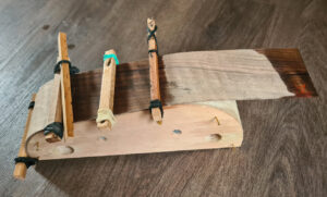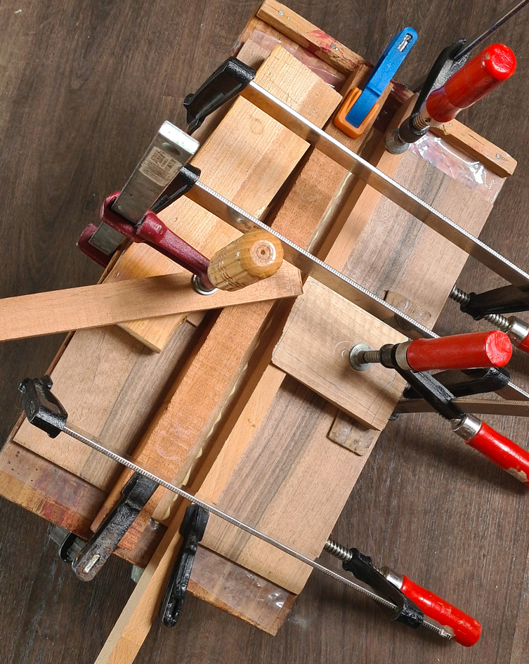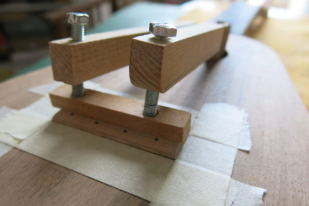 Pour coller les éclisses sur la table, j’utilise une planche cloutée sur les cotés. Je compresse les éclisses sur la table en les emmaillotant à l’aide d’une corde entrelacée autour des clous.
