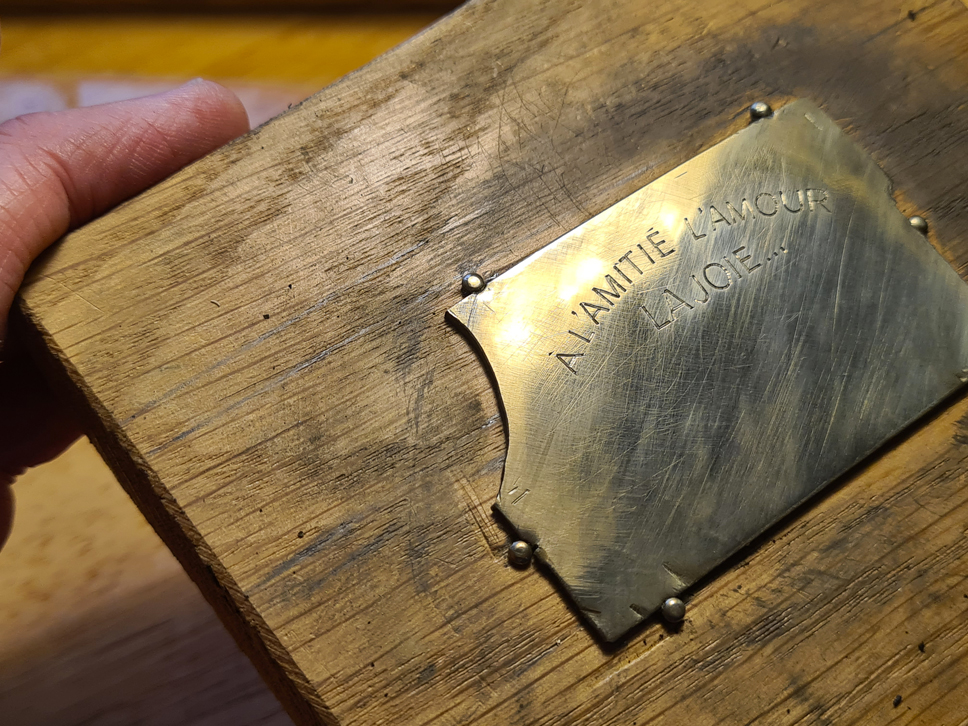Ultime spécificité de la commande, réussir à inscrire les initiales des participants au cadeau (MYAEMA) et une maxime donné par l’initiatrice de cette commande (À l’amitié, l’amour, la joie). J’ai utilisé mes connaissances de graveur pour créer des plaquettes de laiton.