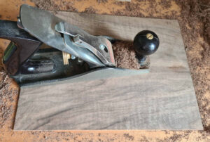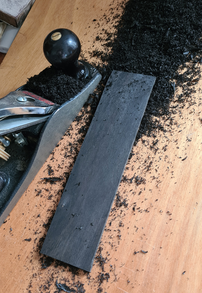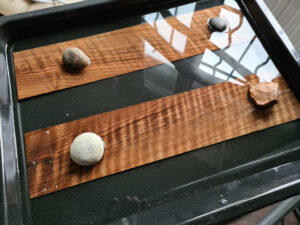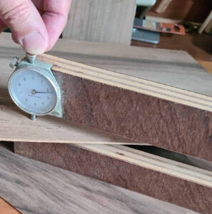 Patiemment, je rabote et ponce la surface des éclisses, dos et table. L’épaisseur à atteindre est de 2 mm. La table sera légèrement plus fine 1,8 mm car la densité et la nervosité du bois le permet et optimisera la richesse sonore du ukulélé. Ces épaisseurs sont vérifiées sur toutes la surface du bois avec un contrôleur d’épaisseur au dixième de millimètre.