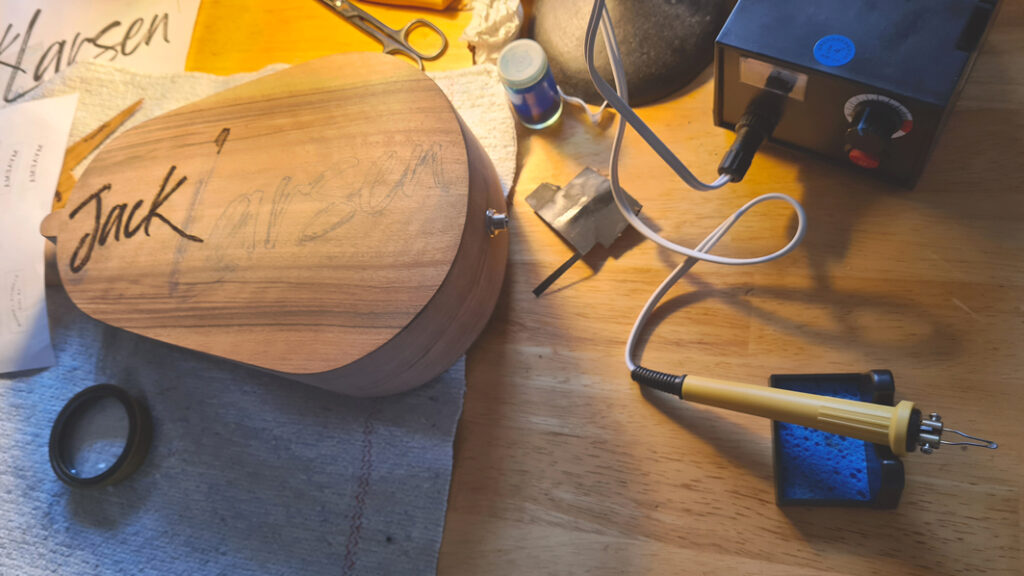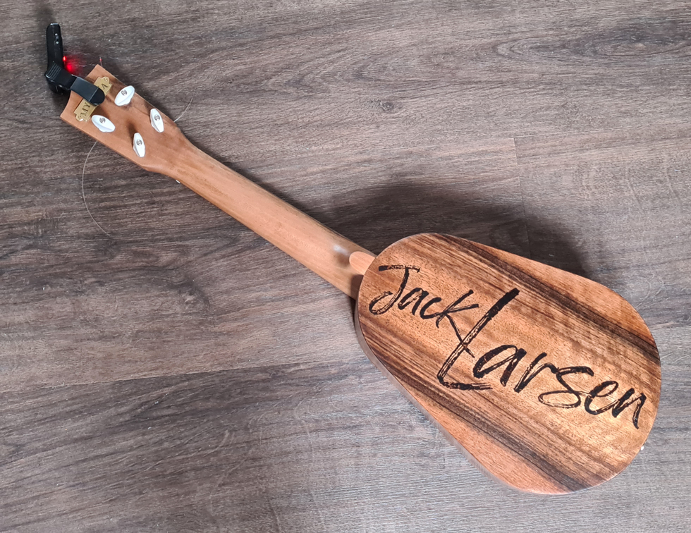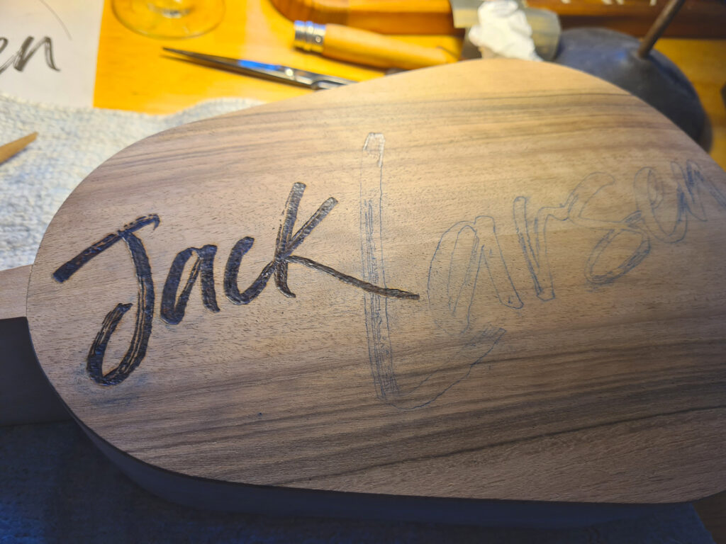 la seconde spécificité de cette commande consistait à inscrire le nom de scène du futur propriétaire au dos de l’instrument. Après plusieurs essais, j’ai choisi de pyrograver sa signature directement sur le fond du ukulélé.