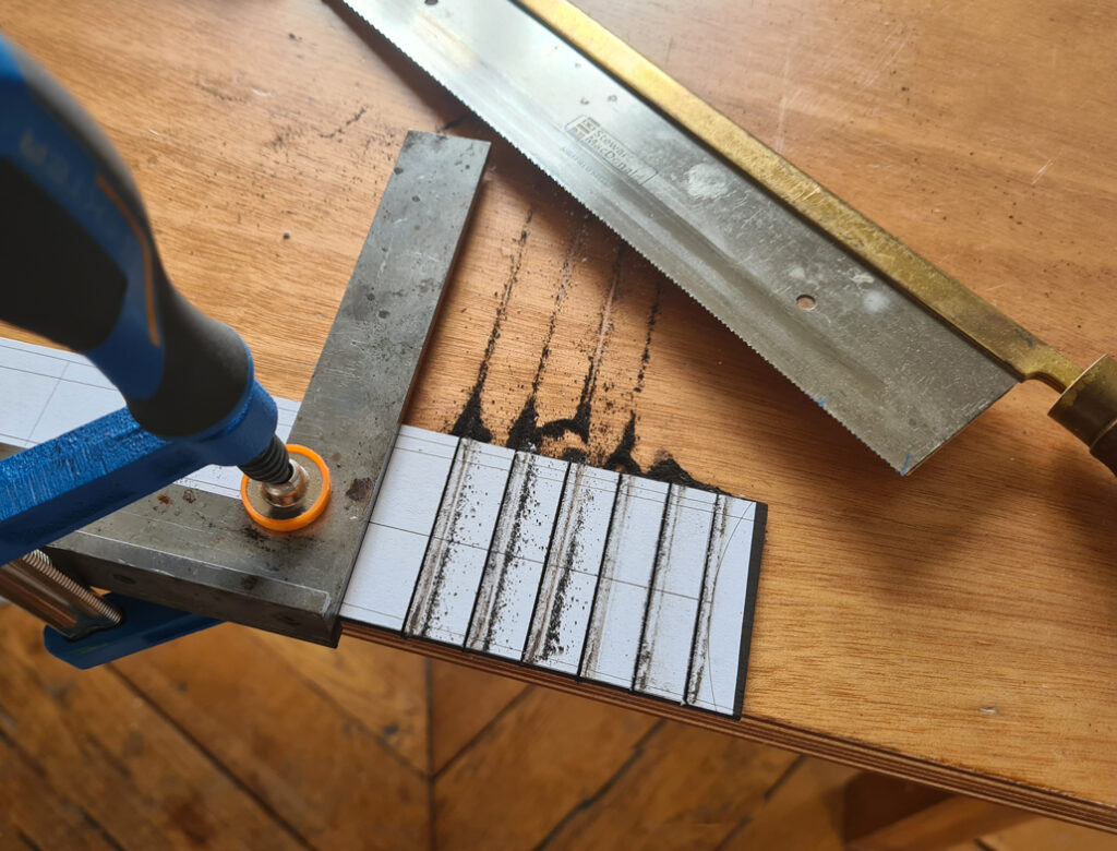 La touche en ébène est réduite à l’épaisseur de 3,5 mm, je colle dessus une impression de l’emplacement de chaque frettes, ce qui me permet de scier précisément les rainures destinées à les recevoir.
