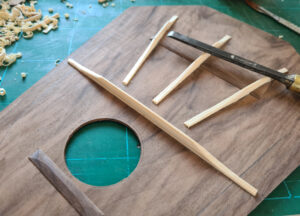 Les barrages sont découpés dans de l’épicéa, collés et sculptés, les barrages sous la table sont affinés pour libérer les vibrations. Je vernis l’intérieur du dos avec un vernis à