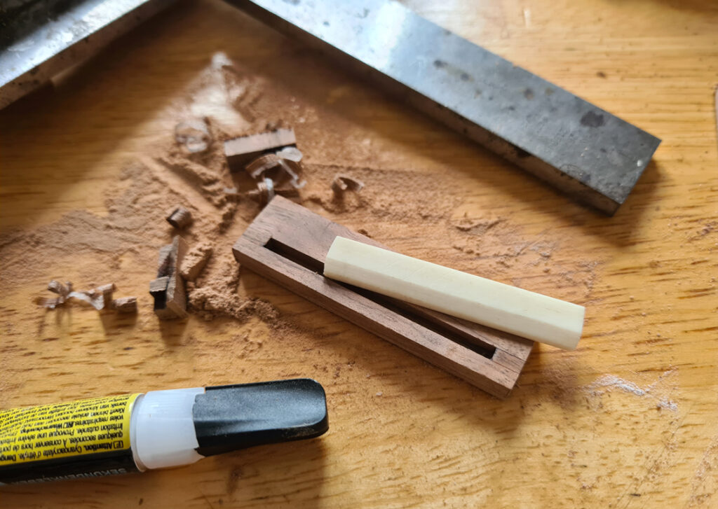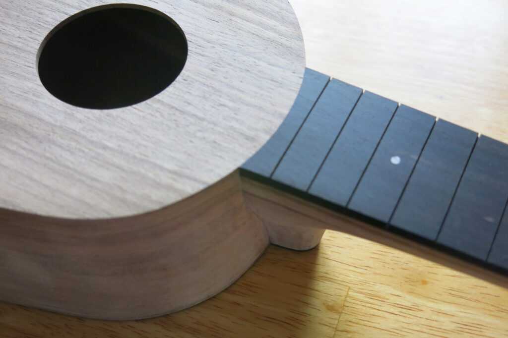 Après l’ébauche et l’affinage du manche, la touche y est collée. L’étape suivante consiste à assembler le manche à la caisse.