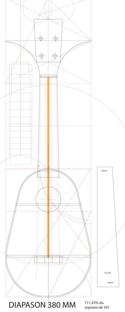 Le ukulélé GO est de type Pineapple ; j’en ai conçu la forme spécifique. Les proportions se sont imposées à moi par l’utilisation des tracés régulateurs du nombre d’or. Le dessin de la caisse évoquant une goutte d’eau, je l’ai baptisé « GO » (G pour Goutte, O pour Eau).